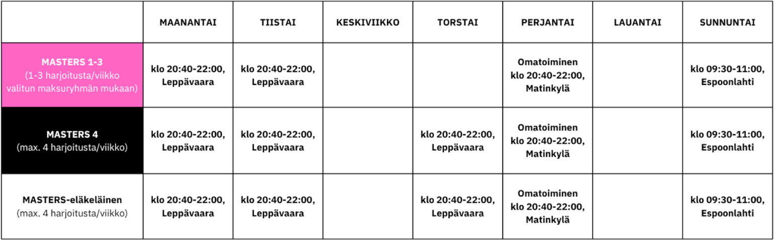 Mastersien harjoitukset järjestetään hallin aukioloaikojen ulkopuolella, sillä Espoon kaupunki ei myönnä aikuisille harrastajille vuoroja aukioloaikojen sisällä. Hallin ovet sulkeutuvat klo 20:00, jolloin kulku harjoituksiin tapahtuu odottamalla poistuvien asiakkaiden avatessa ovet. Ovia ei missään tapauksessa saa vääntää auki. Kertakäyttöisen harjoitusrannekkeen saa Leppävaarassa ja Espoonlahdessa eteisaulojen kulkuporttien yhteyteen sijoitetusta laatikosta.